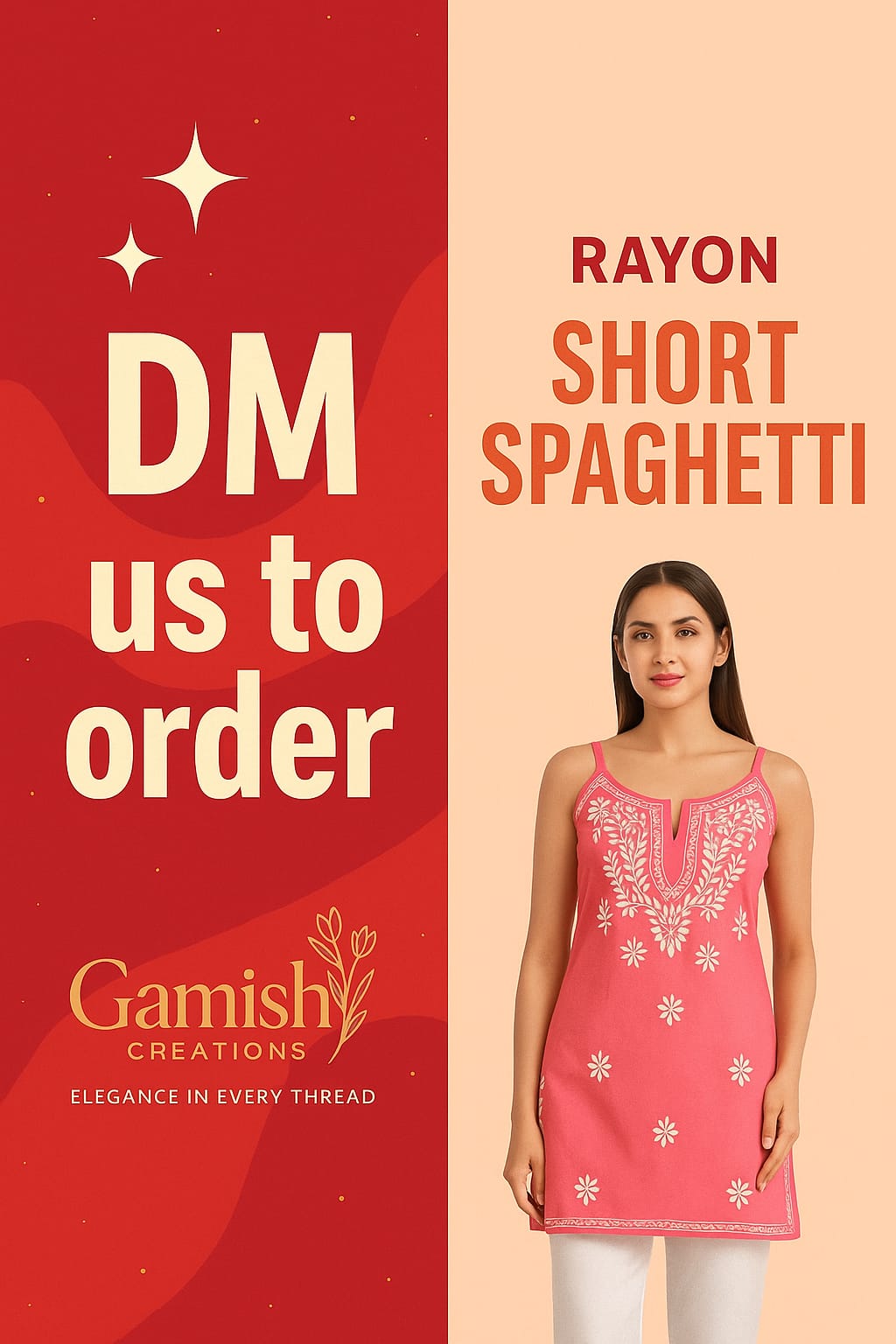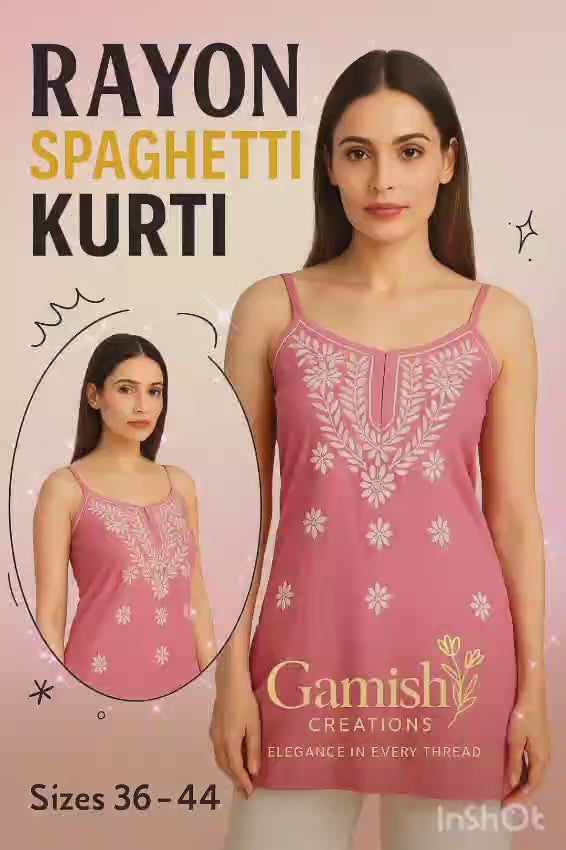 Rayon Short spaghetti kurtiDiscover the comfort of our Rayon Short Spaghetti Kurti. Made from high-quality rayon, this kurti offers effortless style and breathability for all-day wear. Its spaghetti straps provide a chic touch while keeping you cool in warm weather. Perfect for any occasion, this kurti is a must-have addition to your wardrobe.